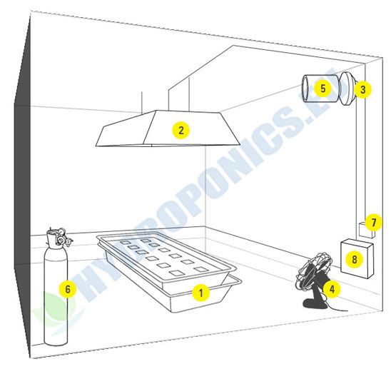 Uma vez estabelecido o local da estufa falta instalar o objeto mais importante do projeto: o espectro solar, que no mundo da jardinagem é simulado pelas lâmpadas agrolights. O tamanho e potência da lâmpada vai depender do tamanho da estufa, mas os fornecedores em geral tem tabelas que podem auxiliar na hora da compra. É importante notar que além da lâmpada é preciso ter transformador para a potencia da lampada e um refletor. Esse arranjo deve ser montado por você mesmo. Veja como exemplo o arranjo de hidroponia da figura abaixo.